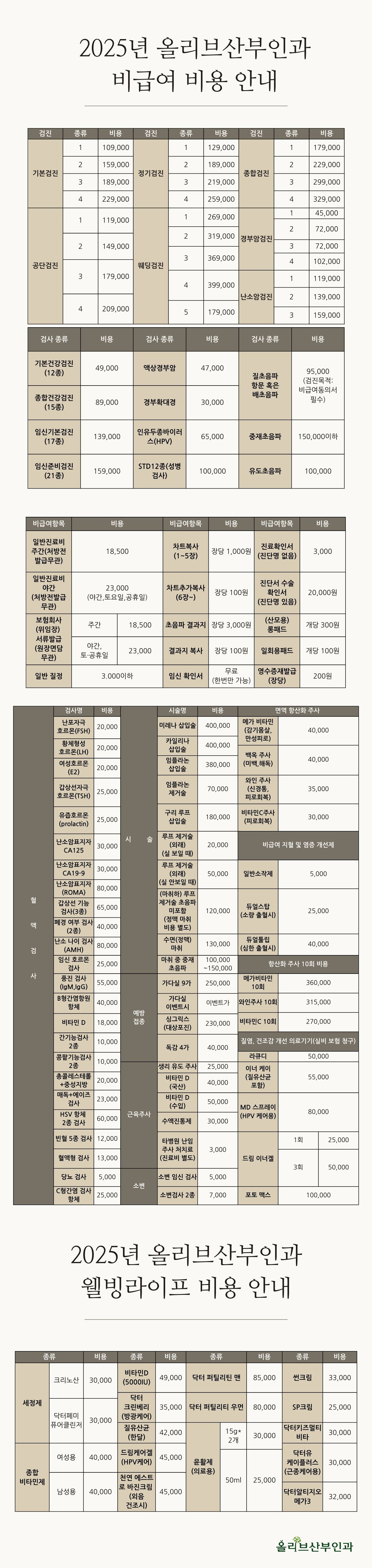 2025년 올리브산부인과 비급여비용 안내
